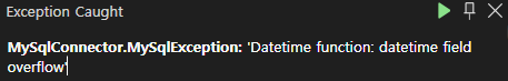 DateTime.MaxValue는 9999년 12월 31일 23:59:59.999999이므로 MySQL DATETIME의 최댓값인 9999-12-31 23:59:59를 초과한다. Exception은 다음과 같다.